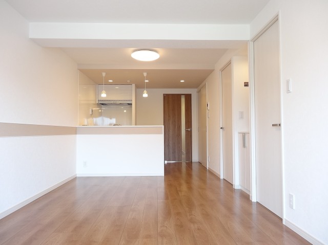 廊下をまっすぐ進んだ突き当り正面の扉の奥は約14.0畳のLDK。