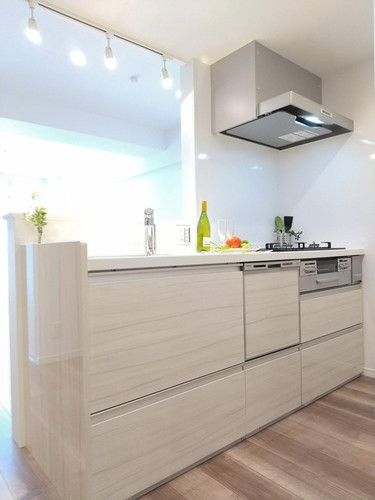 解放感があって調理中でもコミュニケーションが取りやすいのが特徴です。カウンターキッチンの解放感には度合いがあって、フラットトップ&ガラスの衝立の最高に開けたものから、パネルや吊戸棚を付けた独立感の強めのものまで様々。こちらは、コンロ前にだけしっかりとパネルが付けられたちょうど真ん中くらいですね。食器洗浄乾燥機や浄水機能一体型水栓などの便利機能も充実していますよ。