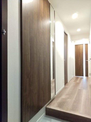 玄関廊下は白いクロスと濃いめのフローリングの落ち着いた雰囲気。新規リノベーションということでとてもキレイですね。上り口はしっかり段差があるタイプ。靴を履く時などにちょっと座ったりできて便利です。