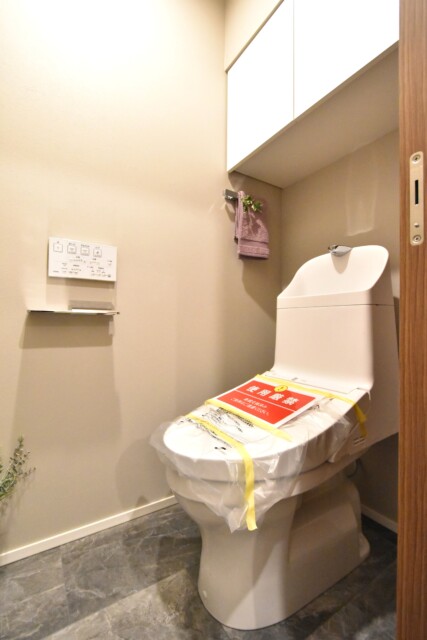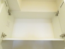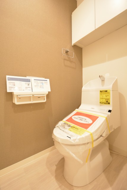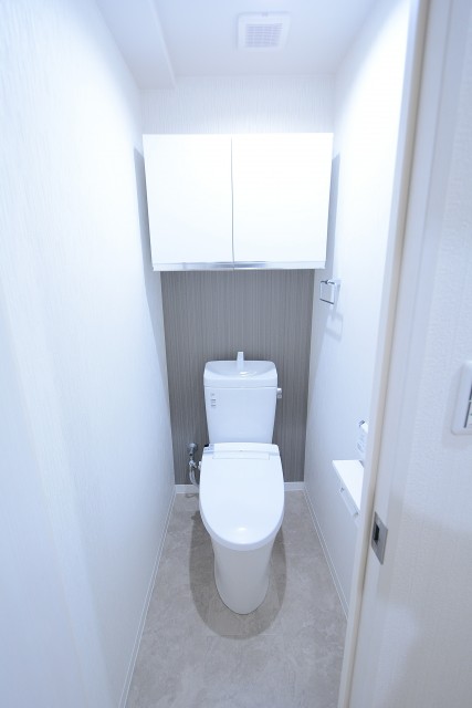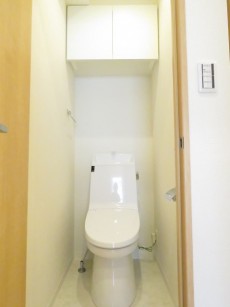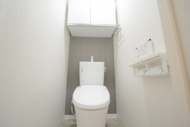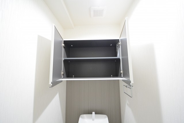 ウォシュレットとペーパーのストックを保管しておくのに便利な吊戸棚がついています。