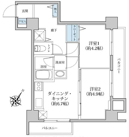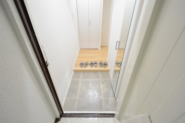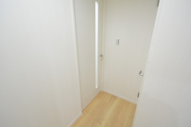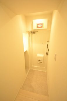 廊下を突き当りさらに奥へ。シューズBOX、洗濯機置場、トイレが廊下側にあります。