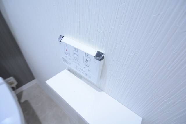 大理石風の床がトイレ感ありますね。ウォシュレット機能の操作は壁のパネルでどうぞ。