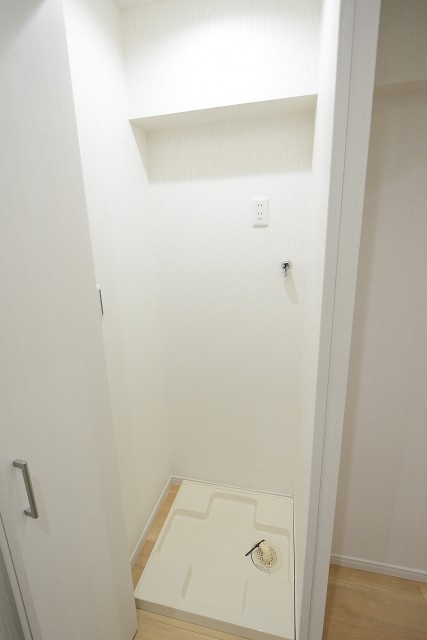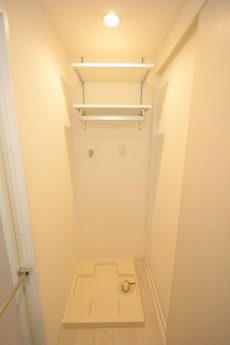 シューズBOXのお隣は洗濯機置場。使わない時は扉を閉めておけば生活感もバッチリ隠せます。洗濯機置場向かい側にはちょっとしたインテリアや一輪挿しを置くのにピッタリなカウンターも設置されています。