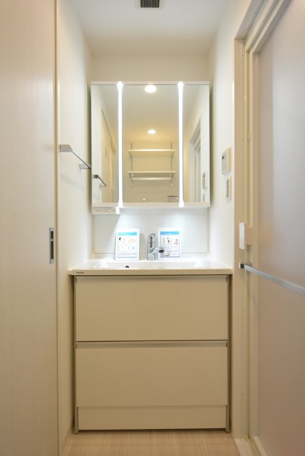 表扉の一部には縦長の鏡も設置されており、お出かけ前の身だしなみチェックもサッと出来て便利です。