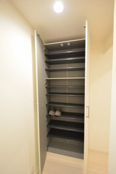 シューズボックスは床から天井までのトールタイプ。可動式棚なのでレインシューズやブーツ等の高さのある履物もラクラク収納です。