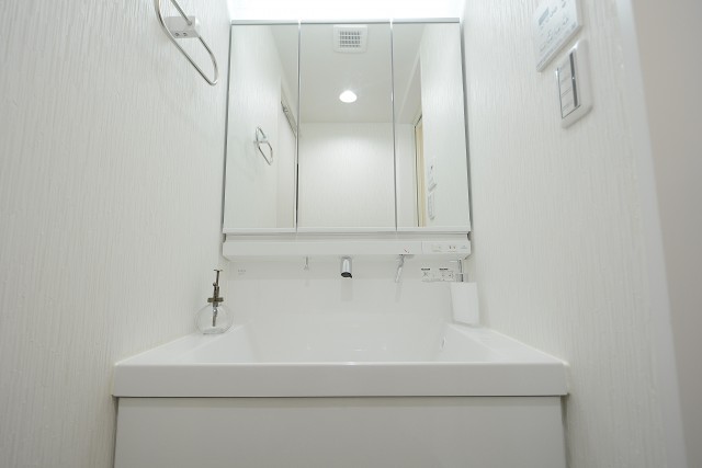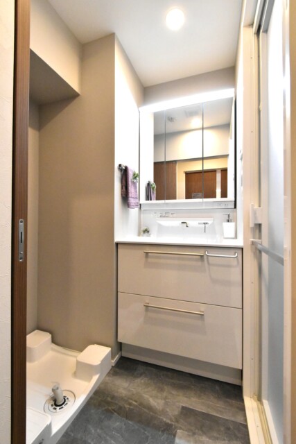こちらもうまく梁と壁の間に洗面台と洗濯機が収まっています。水回りの床は大理石風なんですね。