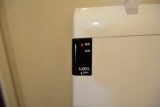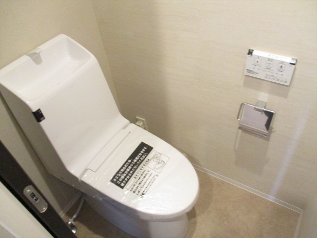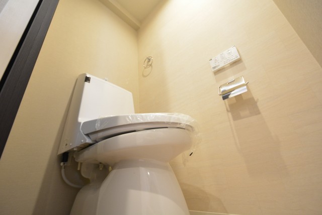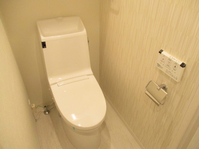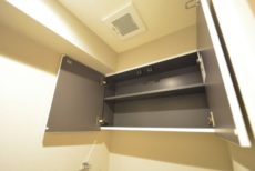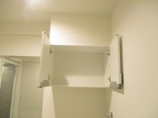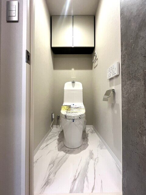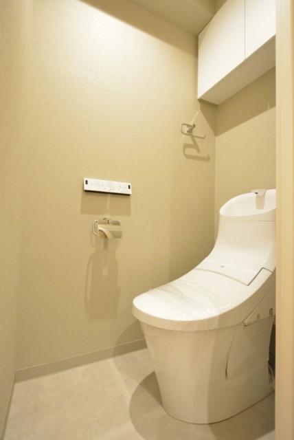 トイレはTOTO製の温水洗浄機能一体型。トイレットペーパーなどの収納に便利な吊り戸棚も付いています。