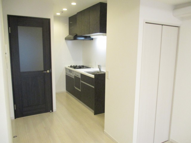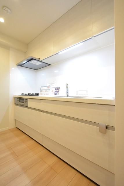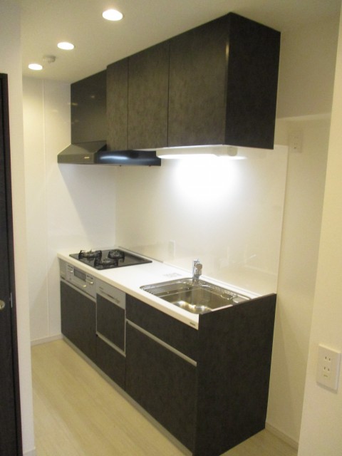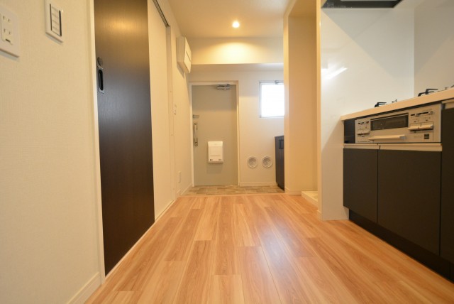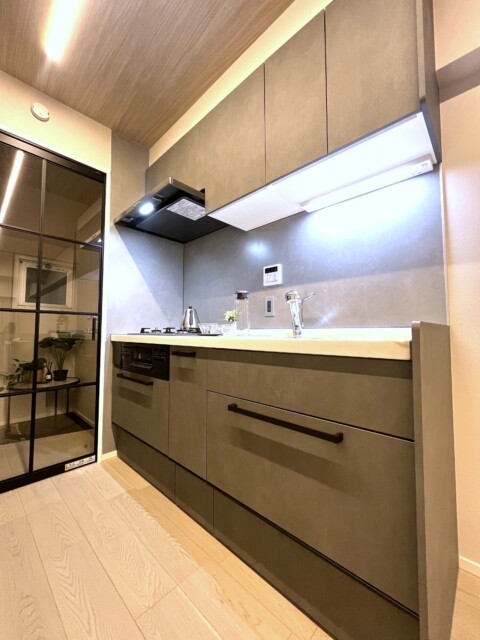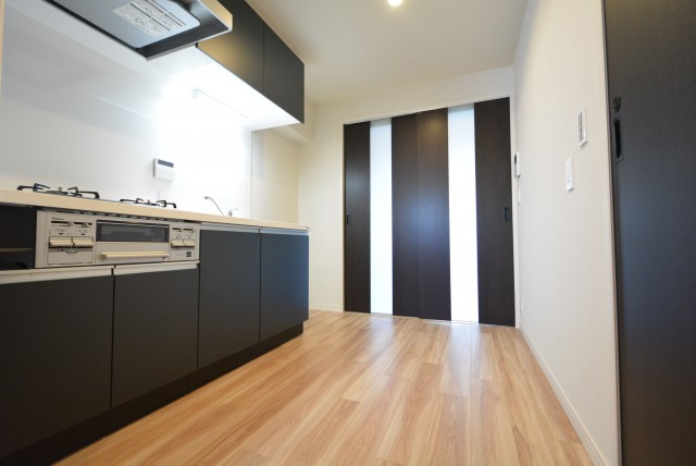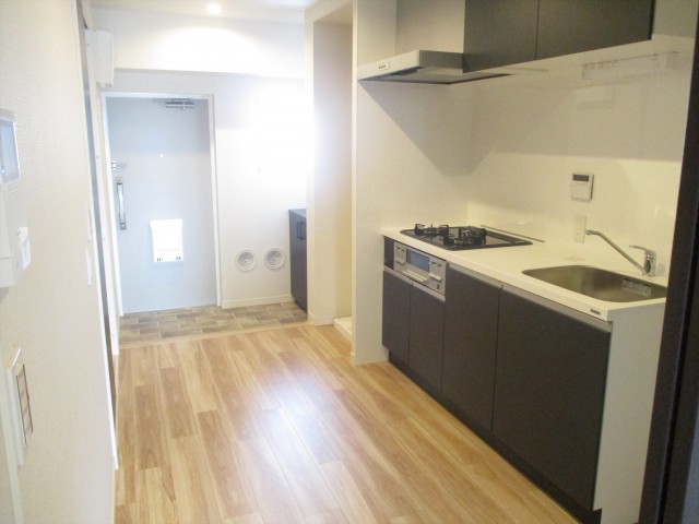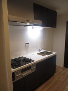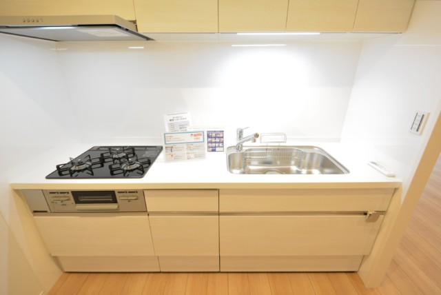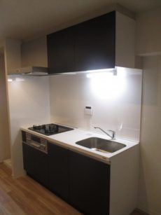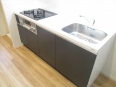 キッチンは壁付けタイプ。場所をとらずにお部屋を広く使えるのが特徴です。ただし、玄関からも丸見えになるのでなるべくキレイにしておきましょう。