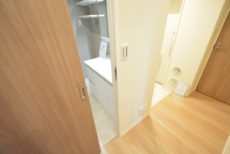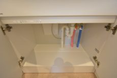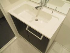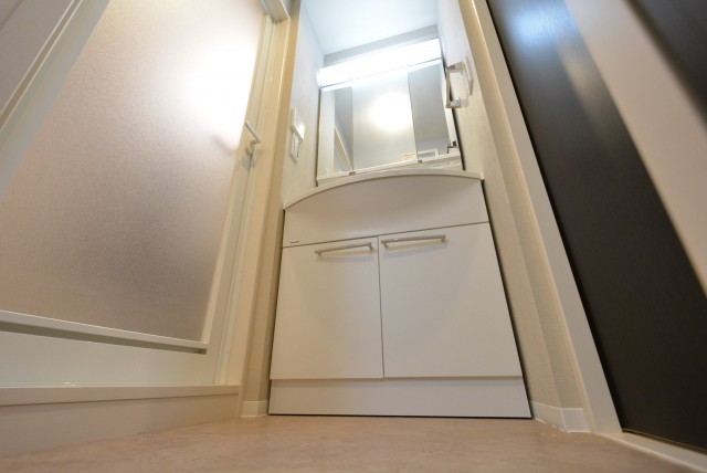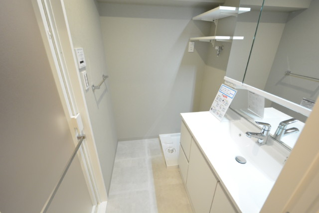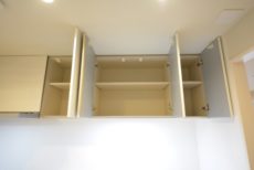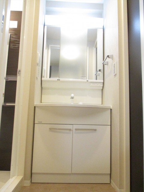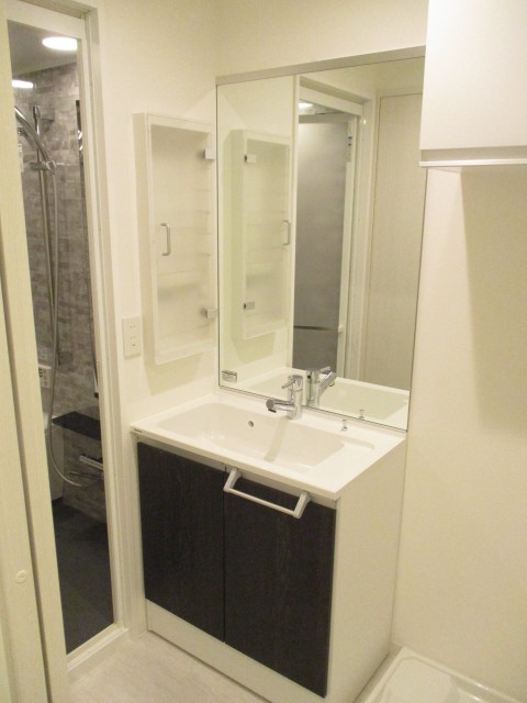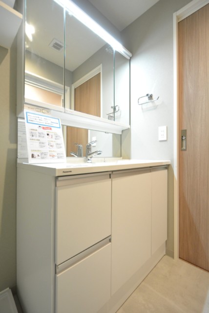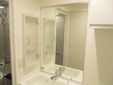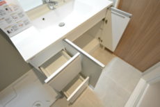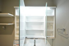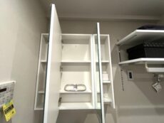 洗面化粧台には身だしなみを整えるのに便利な三面鏡が付いています。裏がキャビネットになっているので、洗面周りに散らかりがちな細々したものもスッキリと片付けることができますよ。ランドリー用品は洗濯機スペース上の吊り棚へどうぞ。
