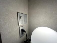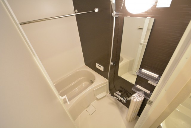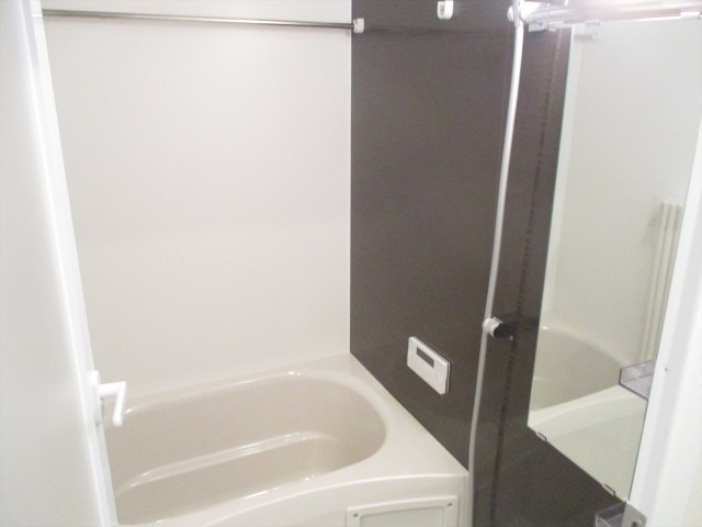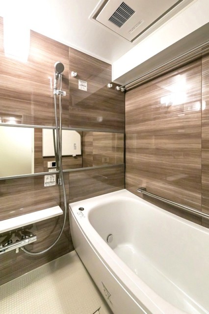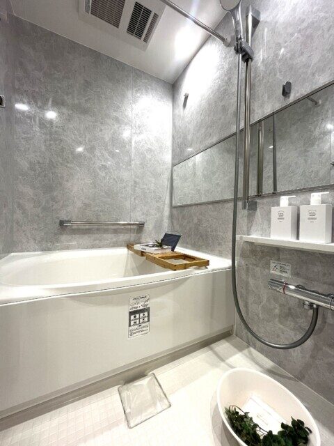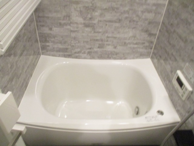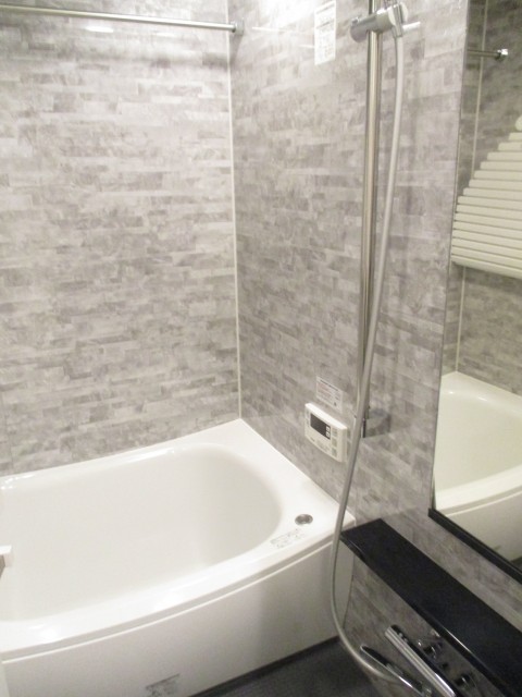 浴室はグレーのストーン調パネルでスタイリッシュな印象。明日への活力が湧いてきそうです。追い焚き機能が付いているのでお風呂の準備もボタンひとつ!保温もしてくれるので長風呂派の方でも安心です。