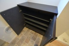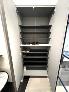 シューズボックスはトールタイプ。収納力は抜群!可動式の棚を調節すればブーツなどでもそのまま収納可能です。人感センサーが自動的にライトを点けてくれるので、もう暗い中手探りでスイッチを探す必要はありません。なにより、いつでも明るい玄関が迎えてくれるのが嬉しいですよね。