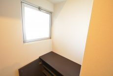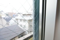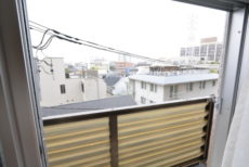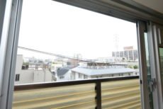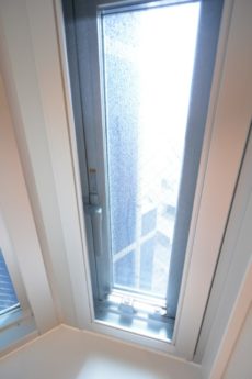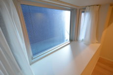 大きい窓はバルコニーに通じていますので後程ご紹介します。北西向きの小さい方の窓の外は、建物越しに遠くまで見晴らせる開放的な眺め。プライバシーの為に目隠しも付いています。窓にはペアガラスが使われていますので、防音もバッチリですよ♬