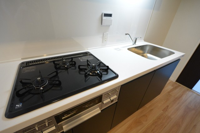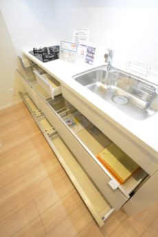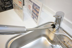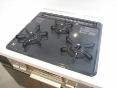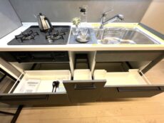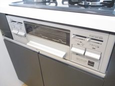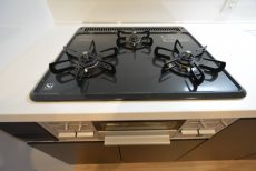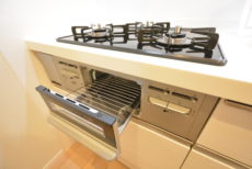 コンロは3口、グリルも付いています。グリルって魚イメージが強いと思いますが、他の料理にもいろいろと使えるらしいですよ。ご興味のある方は是非調べてみて下さい。水栓は浄水機能一体型。