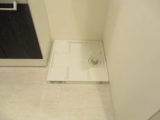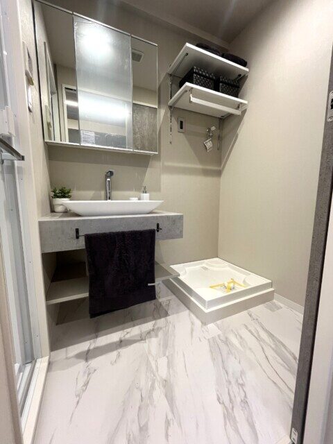 洗面室には洗面化粧台の他に洗濯機スペースと浴室がまとまっていて脱衣室も兼ねています。洗面化粧台は無駄のないミニマルスタイル。simple is the bestですね。