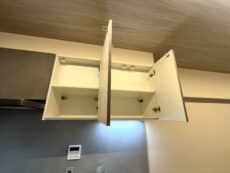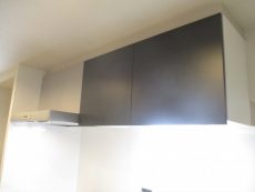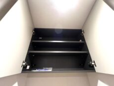 収納は出し入れのしやすいスライドキャビネット。ぎっしり詰めても中身のチェックがしやすいのも嬉しいですね。上には吊戸棚も付いています。