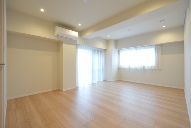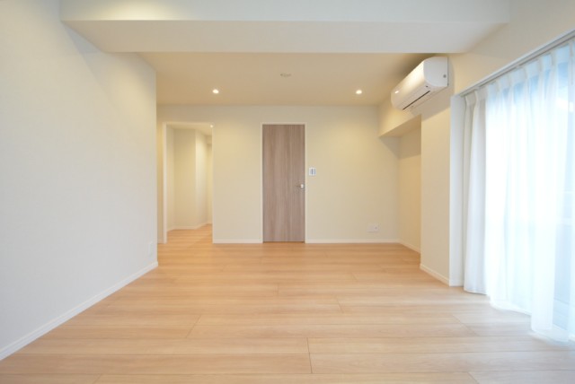 こちらは約11.6帖のリビング・ダイニング。南西の二面採光で明るく、風通しの良いお部屋です。真四角の形でレイアウトの自由度も高そう。ダイニングを広めにしたり、リビング部分を充実させたりと、ライフスタイルによって変えられて便利ですね。