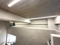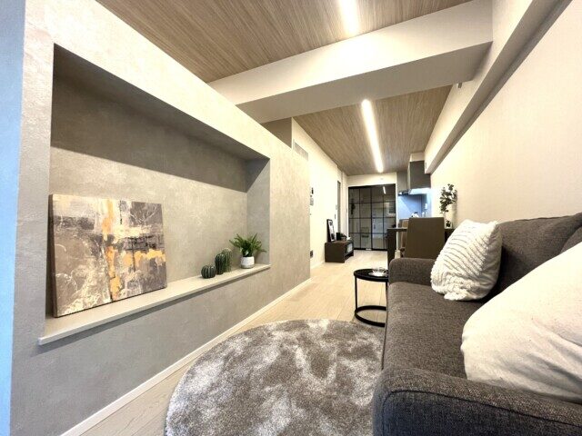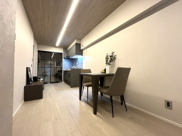 天井にも木目を使用していますが、アクセントや家具の影響で全体としてはモダンな印象です。ちなみに置かれた家具はディスプレイ用なので付いては来ませんが、色やサイズ、質感などの参考にさせてもらいましょう!