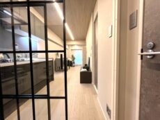 エレベーターで4階まで上がり、内廊下部分を進むとお部屋に到着です。今日のように雨風の強い日でも全然影響がないのがいいですね。
