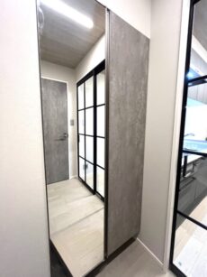 扉に姿見の付いたシューズボックスは収納力のあるトールタイプ☆彡 棚の高さを変えられるのでブーツやヒールなどの高さのある靴でも綺麗に収めることができますよ。