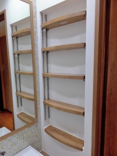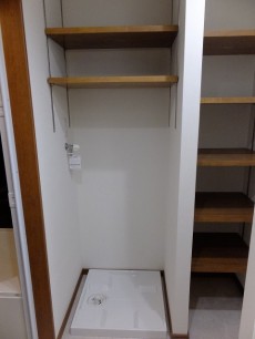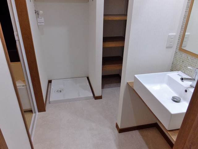 洗濯機置場もなんだかオシャレ(^v^)棚もいっぱいあるので、洗剤置場、バスタオル置場、洗濯物置場・・・いろいろレイアウトできて楽しそう(*^。^*)