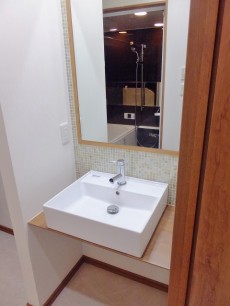 洗面台は木をうまく使ったオシャレな空間☆足元もスッキリ空間があるので、椅子を用意すれば、女性に嬉しい空間になりますね☆