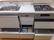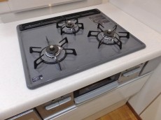 リビングの色調とよく合っていました☆3口コンロに浄水器付水栓、そして食洗機まで付いているので、後片付けもラクチン♪