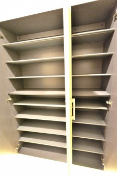 ご覧の通り、収納力◎です!!フロートタイプのシューズボックスは靴の出し入れもしやすく、空間をスッキリ感じさせてくれます。可動式の棚なので、靴のサイズに合わせてご自由にアレンジしてください。