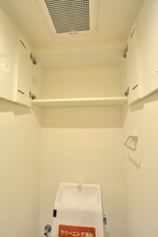 トイレには吊り棚があります。トイレットペーパーのストックや、お掃除道具等、トイレ用品うぃ綺麗に整頓しておけます(^o^)
