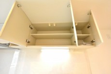 左サイドには高さの調節ができる棚、上部には吊戸棚が付いているので収納に関しては不自由しないですね!!