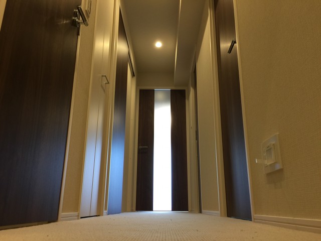 廊下突き当りのお部屋のスリットガラスから廊下に光が差し込んでいます。ドアの向こうは、リビングダイニング!明るいリビングの期待が広がります。