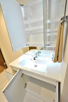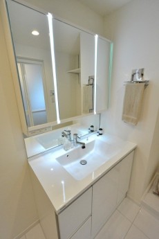 リビングダイニングキッチンの南西側にサニタリールームがあります。室内はとても広く、清潔感があります。