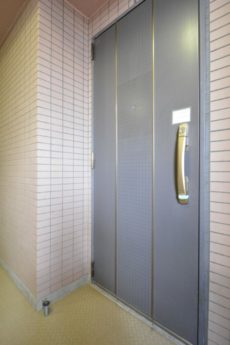 1Fの外廊下を抜けた先にエレベーターが設置されています。こちらのエレベーターでお部屋へ向かいます。