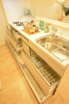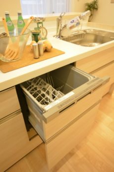 調理台下には食洗機と引き出しタイプの収納。洗い物は食洗機にお任せして、食後はみんなでのんびり出来そうですね♬ 引き出しタイプの収納は奥の方まで使い易くて助かります。フライパンなどは立てて収納すると更にいいらしいですよ。