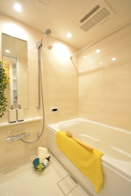 モザイクパターンの床は、すばやく乾燥、楽々お手入れができます☆追い焚きと浴室乾燥機能が付いているので、雨の日でも安心してお洗濯ができますね(*´∀`*)24時間換気機能も付いていますので、浴室のカビ対策にも力を発揮します♪♪