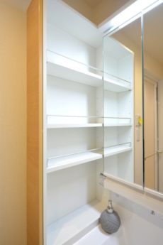 洗面室には、スペースを利用した収納が2カ所あります。リネンの収納にGood!!