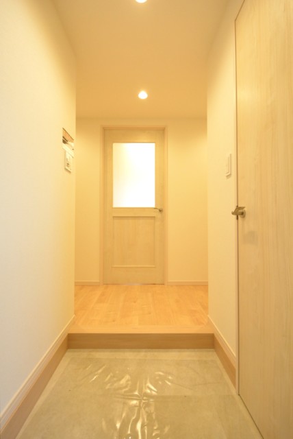 扉を開けると、一直線に廊下が伸びています。照明はダウンライト、長寿命で消費電力の少ないLEDを使用しています。