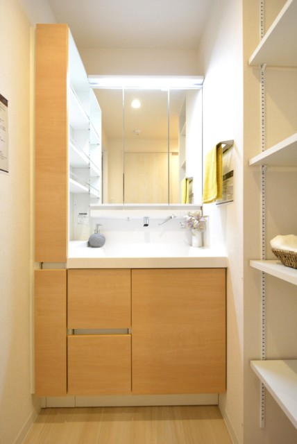 収納は三面鏡裏のキャビネット、洗面台下、側面の棚、リネン棚と盛沢山!細かい物からリネンまで上手いこと納まりそうですね。