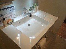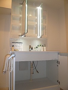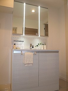 スタイリッシュなスクエア型洗面ボウル、三面鏡でみやすく扉をあければ、お化粧品や細々したたものも整理整頓できますね。ゴチャオゴチャしがちな洗面化粧台ですが、いつまでもピカピカに使いたいですよね。
