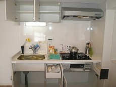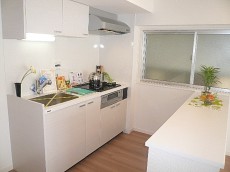 システムキッチンです。背面には真っ白な大活躍しそうなカウンター付!カウンター下部にはみせたくないゴミ箱や重い缶類(ビールなど)などのストックを置いたりと使い勝手が良さそうです。カゴなどを活用すればなんだかおしゃれな雰囲気です。