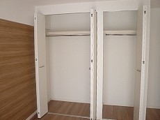 玄関入って右側にある6.4帖の洋室です。収納も2パターンあり2つともポールハンガー付きで充実しています。