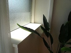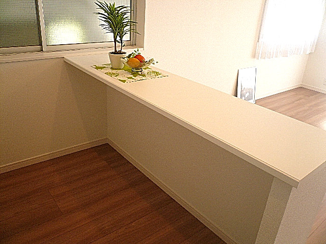 リビング・ダイニングのバルコニードア横にある窓の部分、少しのスペースですがカウンター部分、陽当りの良いこのスペースに緑を置いても良いですね。