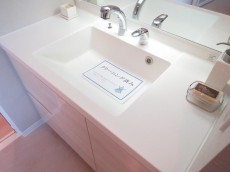 洗面化粧台は鏡の裏、引き出し、と収納スペース豊富。横にはリネン類の置場に便利な棚も設置されています。 棚の一段は着替えの置場として開けておいてもいいかもφ(.. )