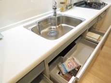 キッチンスペースは約3.5帖。リビングから見えづらいところにあるので、急な来客時も落ち着いて対応できます。水栓は浄水機能付き、コンロは3口ガスコンロ。作業台も広々していて作業もしやすそうです。