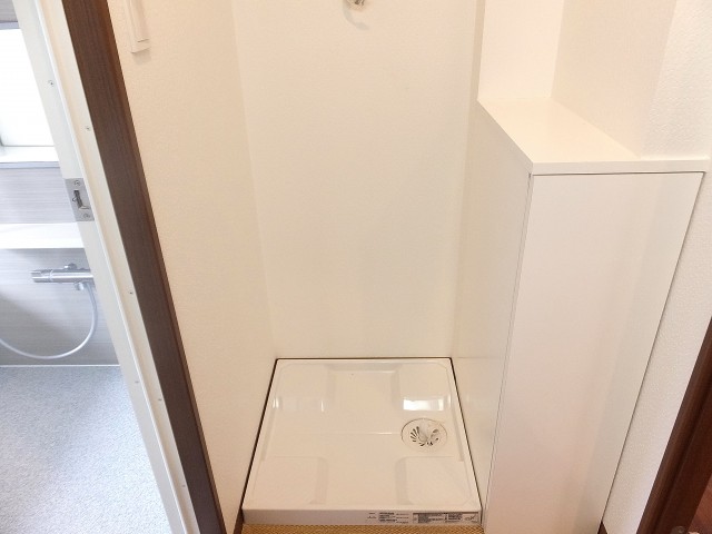 洗濯機置場はこちら。ニッチ的なスペースがあるので衣料洗剤や柔軟剤などが置けます。