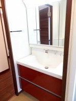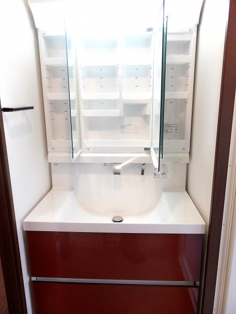 洗面台もキッチンと同じ色を使用しており、かがみの裏は収納スペースになっています^^
