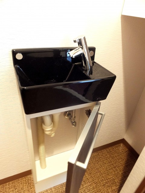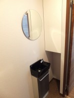 丸い鏡に黒い手洗いはバブル期を彷彿させてくれますね^^!