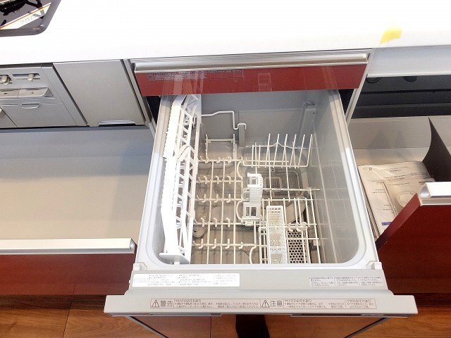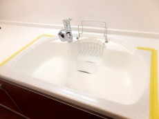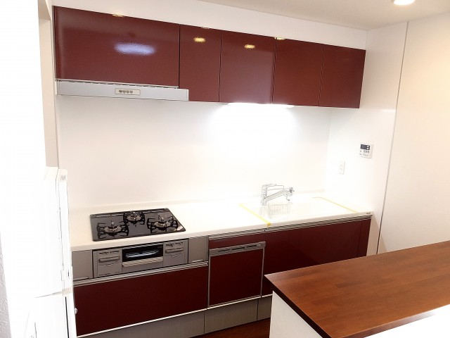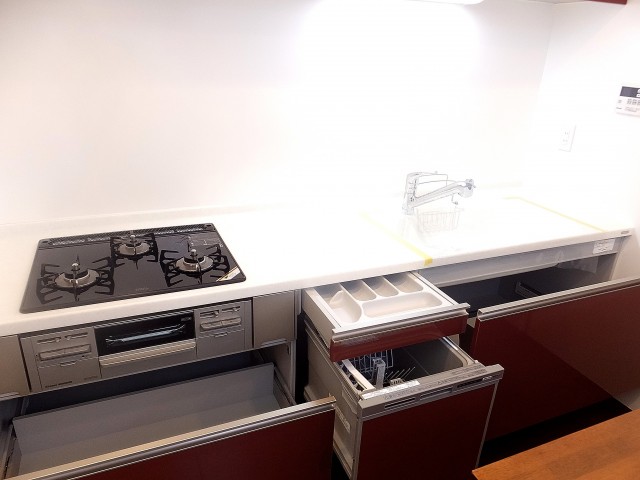 シンクは大きめ、キッチンカウンターの裏は棚になっているので何かと便利です。