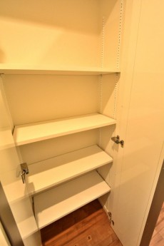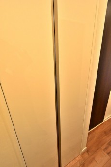 廊下に上がると、ワイドサイズの棚がありました。大きく開く扉なので、中の物がサッととりだせてとても便利です(^_-)-☆