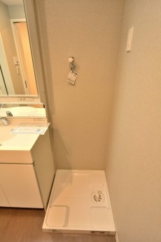 洗面台の隣には洗濯機置場があります。こちらには棚が付いていないので、上部に棚を取り付けて洗剤等を収納してみてはいかがですか。