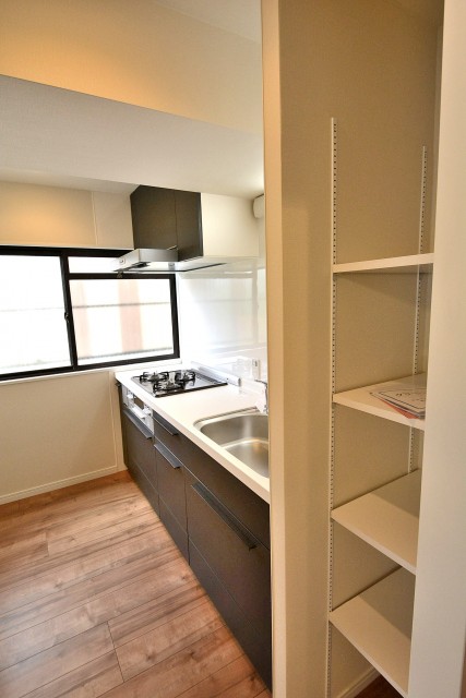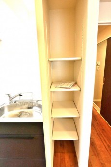 また、キッチンの脇には可動式の棚があります。奥行きがあるので、それぞれケースに入れて引き出しやすくしておけば、食材から調理器具まで色々収納できる便利な棚になりますね(#^.^#)